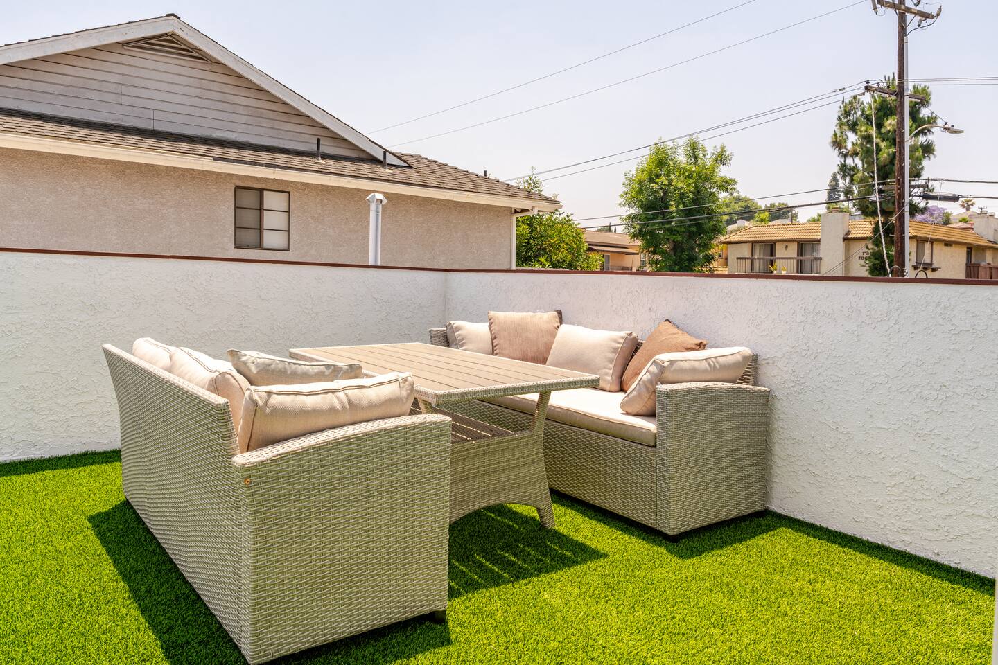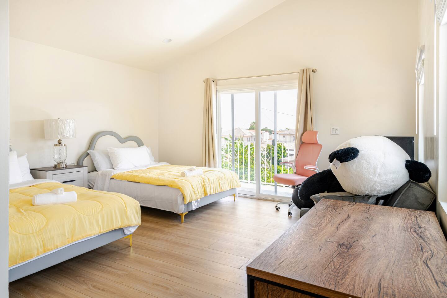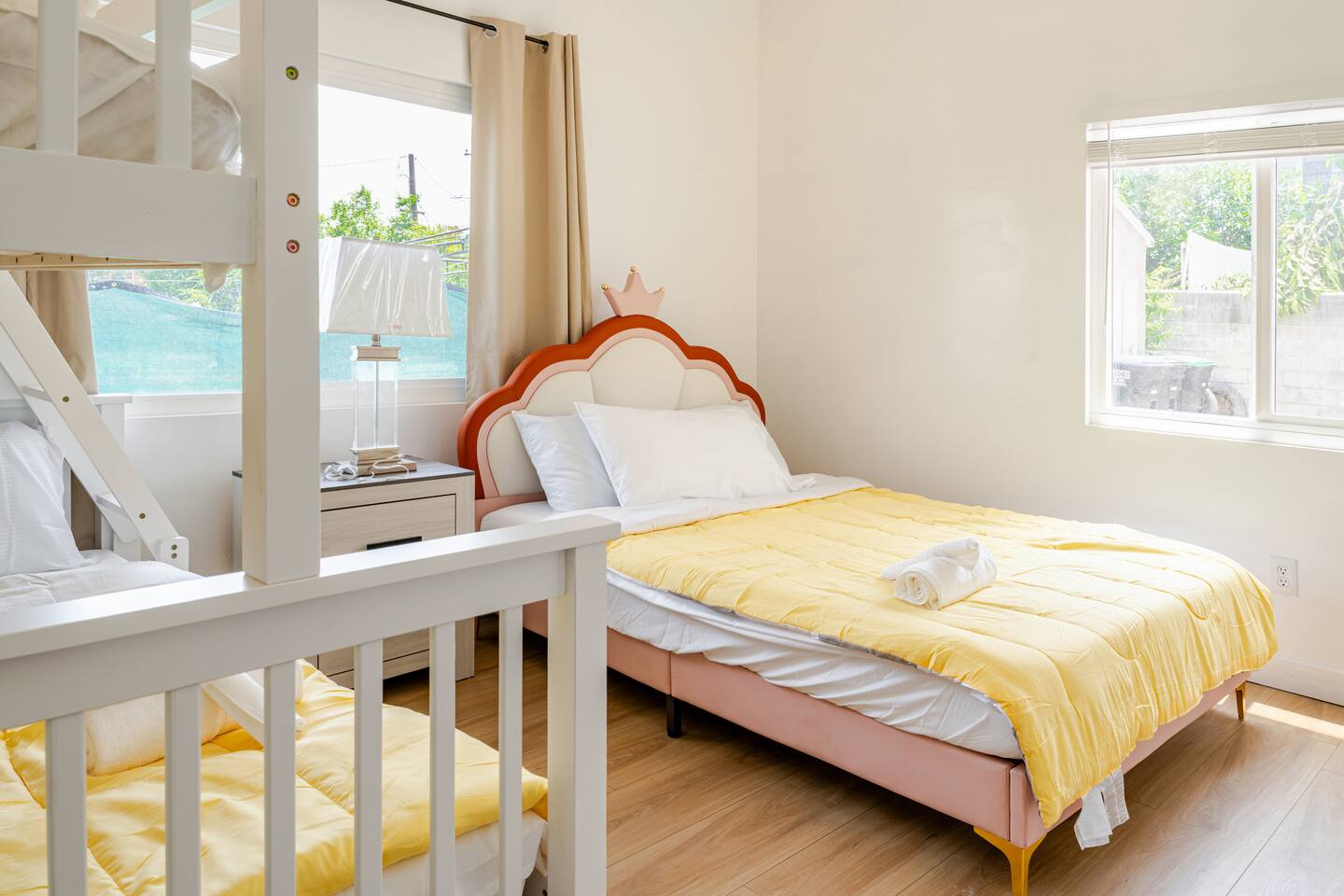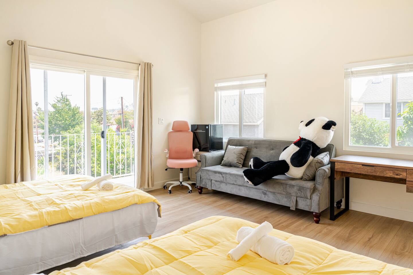 Spacious 2 floor house with large roof top balcony. 5 bedrooms and 4 full bathrooms. Gated side yard, and laundry machines. Parking on driveway and inside the gate. No garage. 1st floor: Room 1: 2 Full beds w/ desk Room 2: 1 Twin over Full bunk bed w/ desk, mini split A/C 1 Full Bath in between (shower over tub) Room 3: 1 Full bed with desk, mini split A/C Living room behind kitchen: 1 Queen Futon. 1 Full Bath in this living room, shower, no tub. Room 4: 1 Queen, 1 Twin over Full bunk bed, en-suite Full bath (shower over tub) 2nd floor: Room 5: 2 Queen beds w/ en-suite Full bathroom (shower over tub) and private balcony. Roof top balcony with outdoor seating.