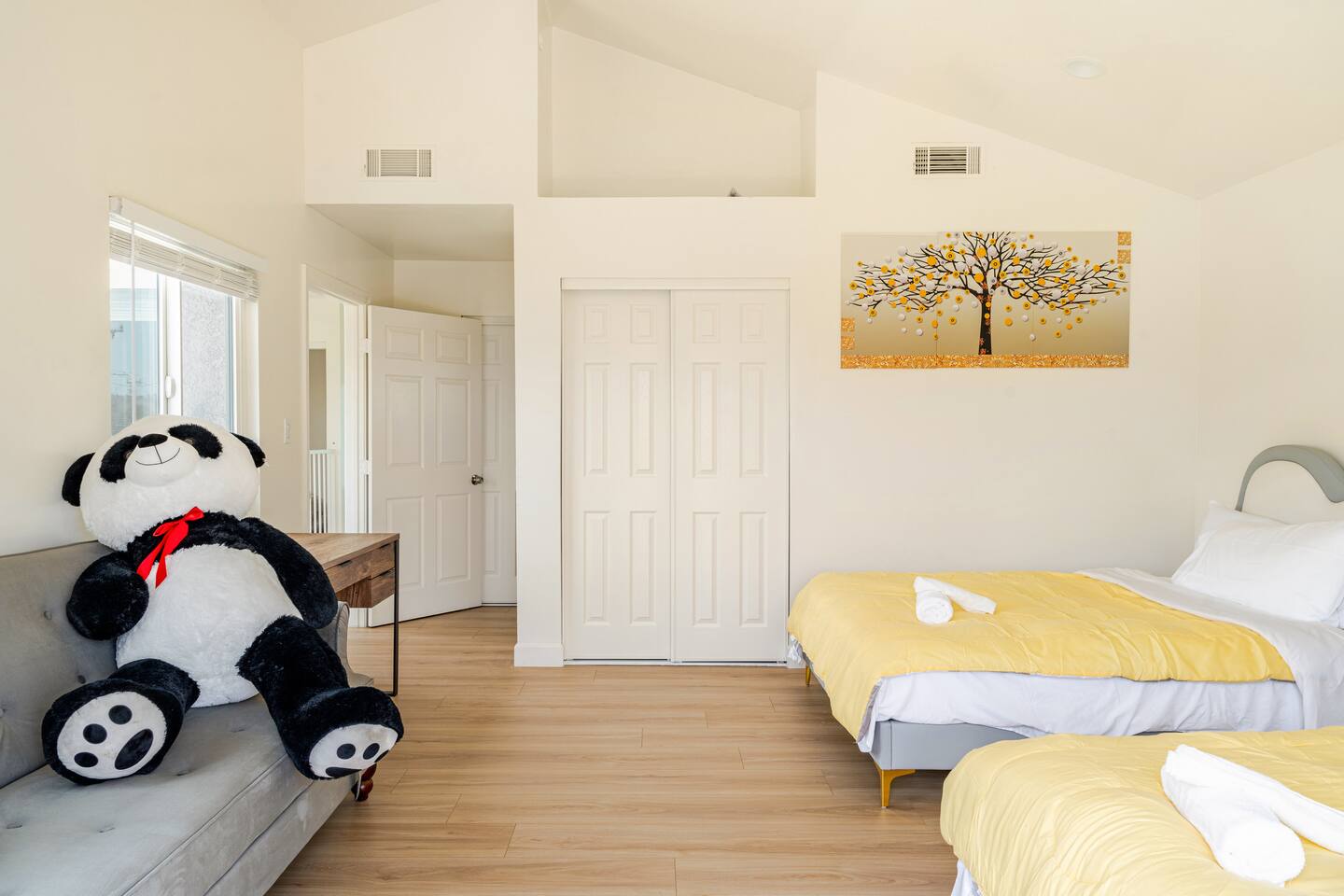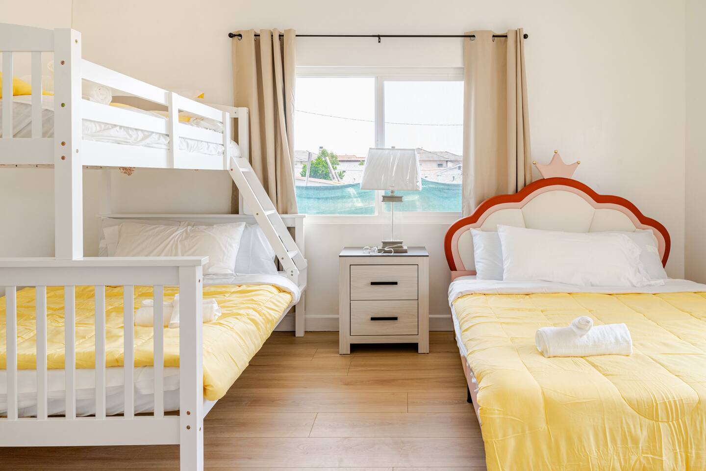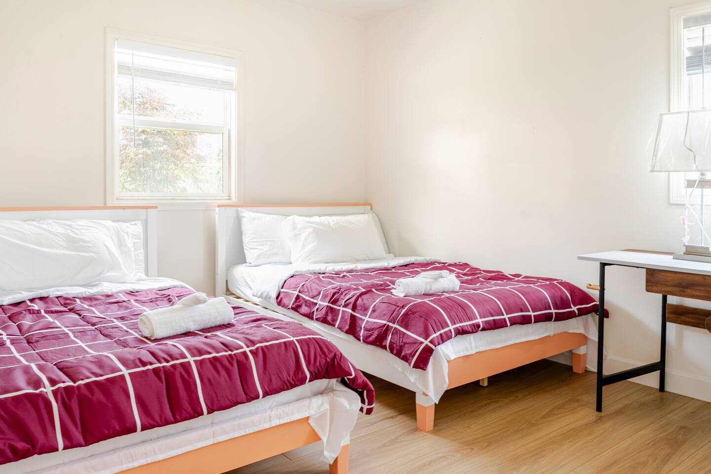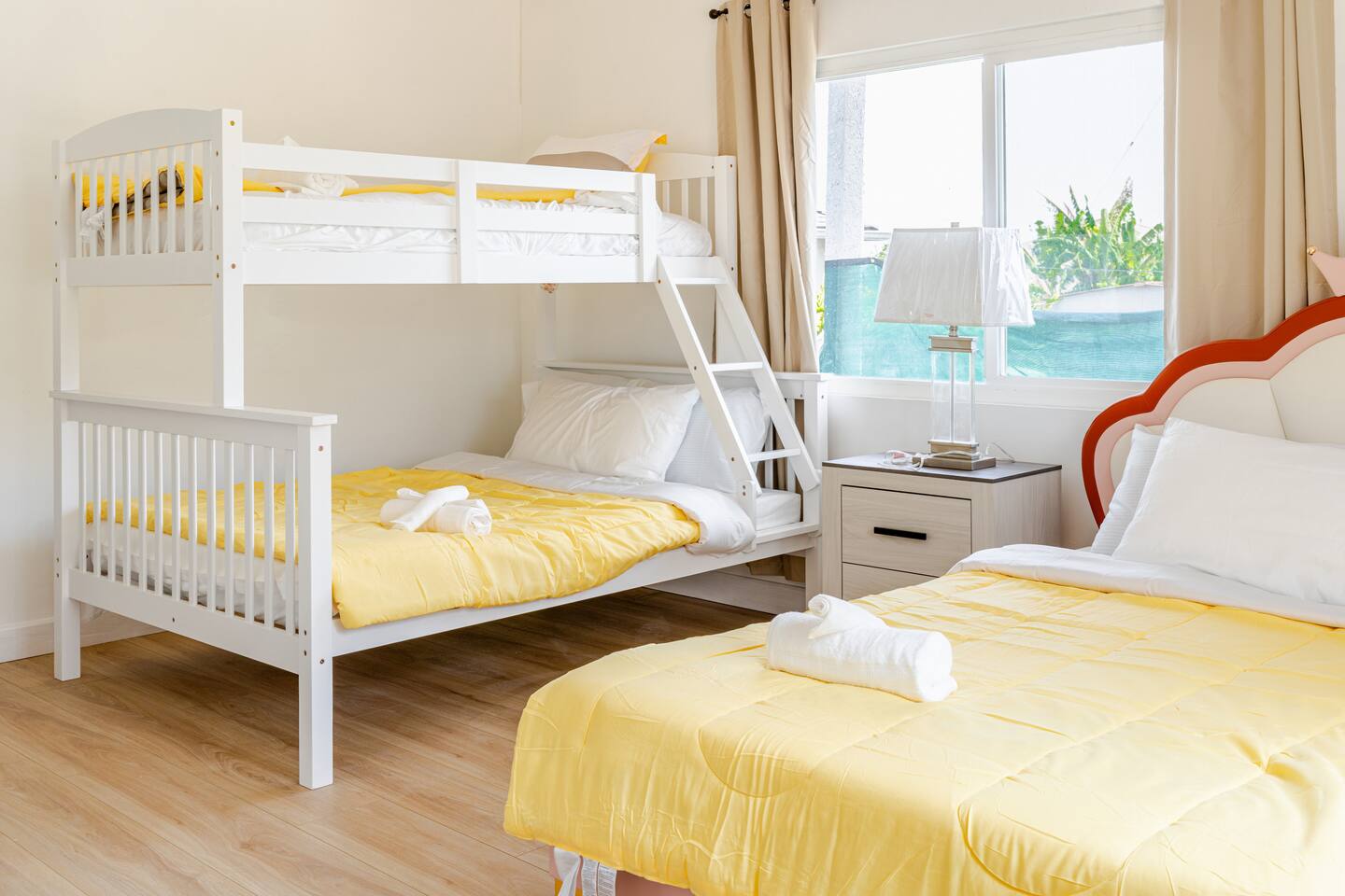 Spacious 2 floor house with large roof top balcony. 5 bedrooms and 4 full bathrooms. Gated side yard, and laundry machines. Parking on driveway and inside the gate. No garage. 1st floor: Room 1: 2 Full beds w/ desk Room 2: 1 Twin over Full bunk bed w/ desk, mini split A/C 1 Full Bath in between (shower over tub) Room 3: 1 Full bed with desk, mini split A/C Living room behind kitchen: 1 Queen Futon. 1 Full Bath in this living room, shower, no tub. Room 4: 1 Queen, 1 Twin over Full bunk bed, en-suite Full bath (shower over tub) 2nd floor: Room 5: 2 Queen beds w/ en-suite Full bathroom (shower over tub) and private balcony. Roof top balcony with outdoor seating.