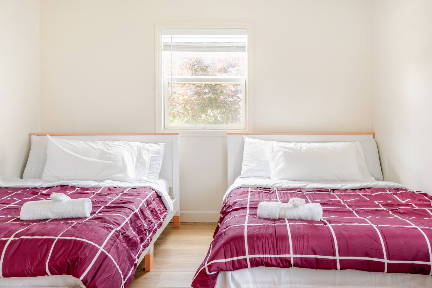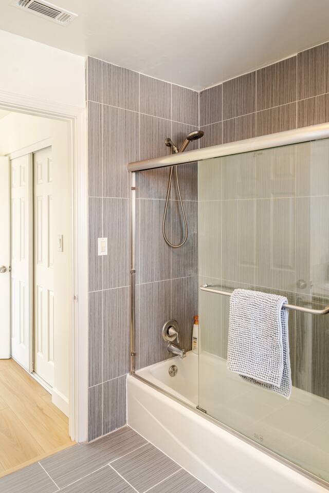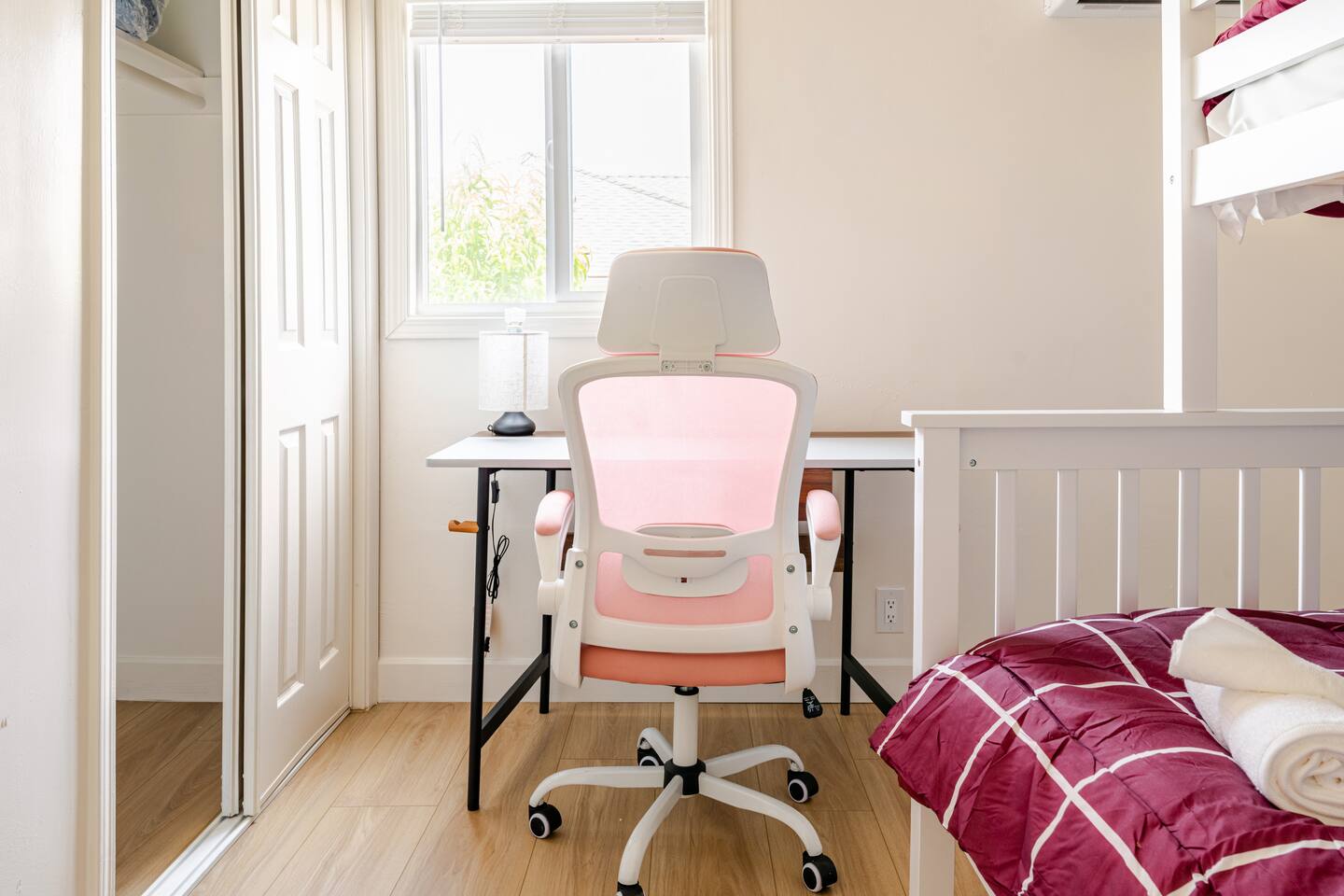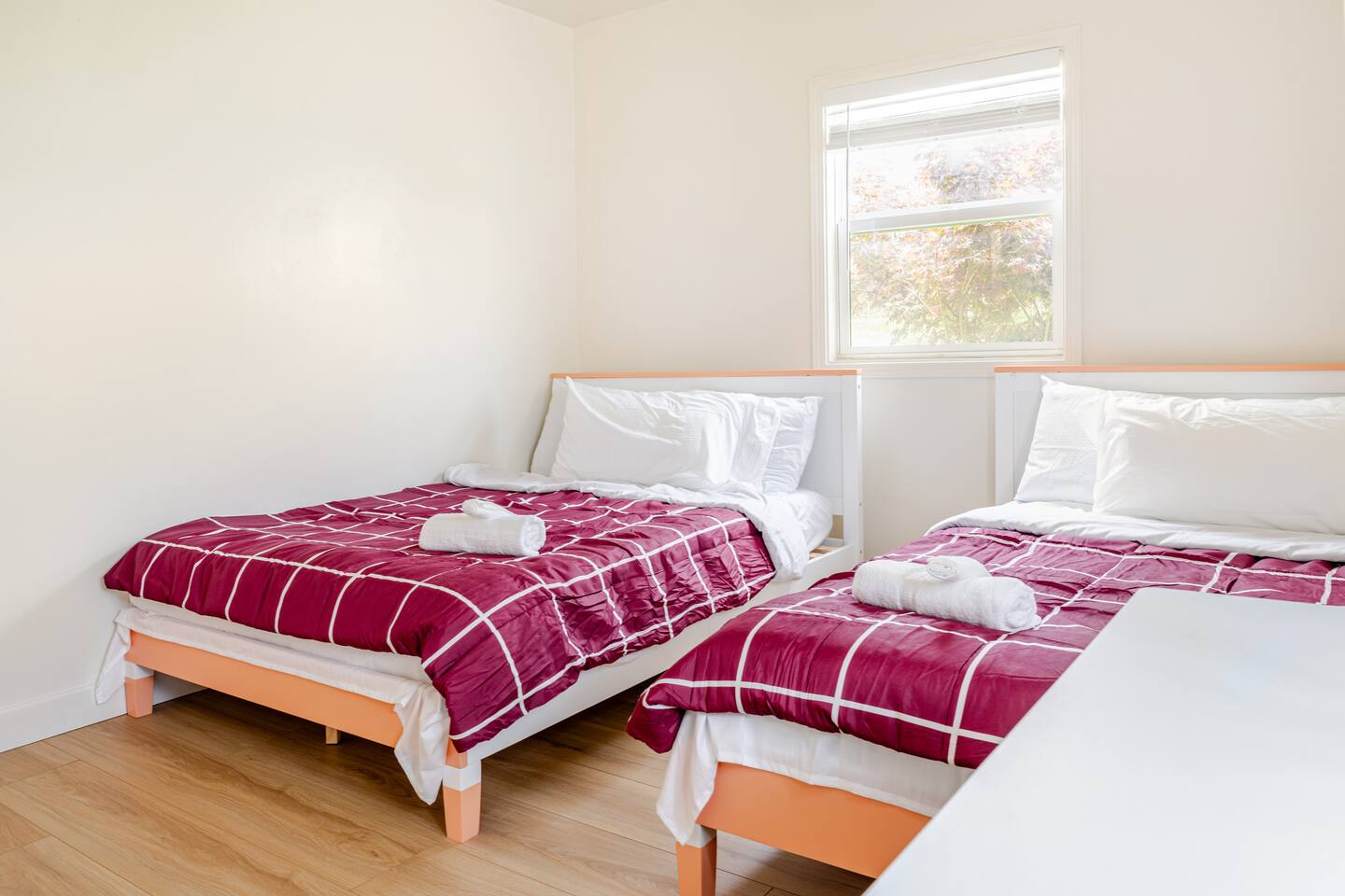 Spacious 2 floor house with large roof top balcony. 5 bedrooms and 4 full bathrooms. Gated side yard, and laundry machines. Parking on driveway and inside the gate. No garage. 1st floor: Room 1: 2 Full beds w/ desk Room 2: 1 Twin over Full bunk bed w/ desk, mini split A/C 1 Full Bath in between (shower over tub) Room 3: 1 Full bed with desk, mini split A/C Living room behind kitchen: 1 Queen Futon. 1 Full Bath in this living room, shower, no tub. Room 4: 1 Queen, 1 Twin over Full bunk bed, en-suite Full bath (shower over tub) 2nd floor: Room 5: 2 Queen beds w/ en-suite Full bathroom (shower over tub) and private balcony. Roof top balcony with outdoor seating.